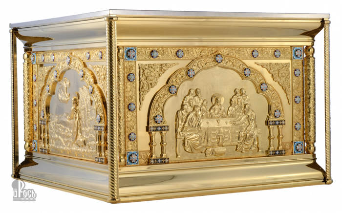 Nowadays, coverings for the holy table are not only made of fabric but can also come in the form of wooden or metal cases, adorned with carvings, precious stones, and cast elements. Our church production offers you holy tables of various types and sizes made of metal, wood, and marble, as well as a variety of coverings with gilding and nickel plating