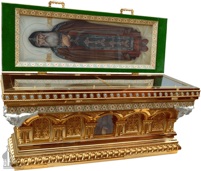 Для украшения часто используется резьба церковной тематики. Углы украшаются ангелами, а по центру располагаются православные кресты. Технология изготовления включает внешнее золочение и серебрение раки.