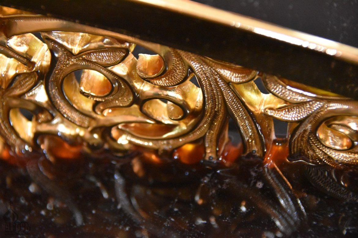 Такой декоративный подход, как золочение изделий, обычно используется в случаях, при которых создание цельного изделия из золота является нецелесообразным из-за его больших габаритов или финансовых составляющих вопроса. Тем не менее, этот вариант отлично подчеркивает изысканность изделия и благородство происхождения металла.