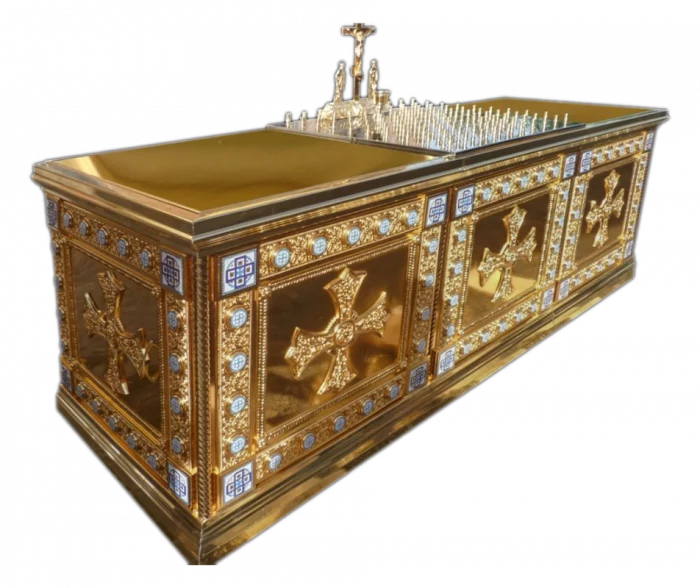 Сторони панахидного столика прикрашені сценами з біблійних сюжетів, різьбленими узорами і хрестами. Зверху є отвори для розміщення свічок, а також Розп’яття з Голгофою. В поминальні дні прихожани, крім запалених свічок, кладуть на такі столи їжу і вино, адже в цей час прийнято здійснювати пожертви на церкву. Панахидний стіл, а також столик для ікон, виконані з дерева або металу, ви знайдете в нашому каталозі, різних розмірів, з різною кількістю отворів для свічок і різним декоративним оформленням